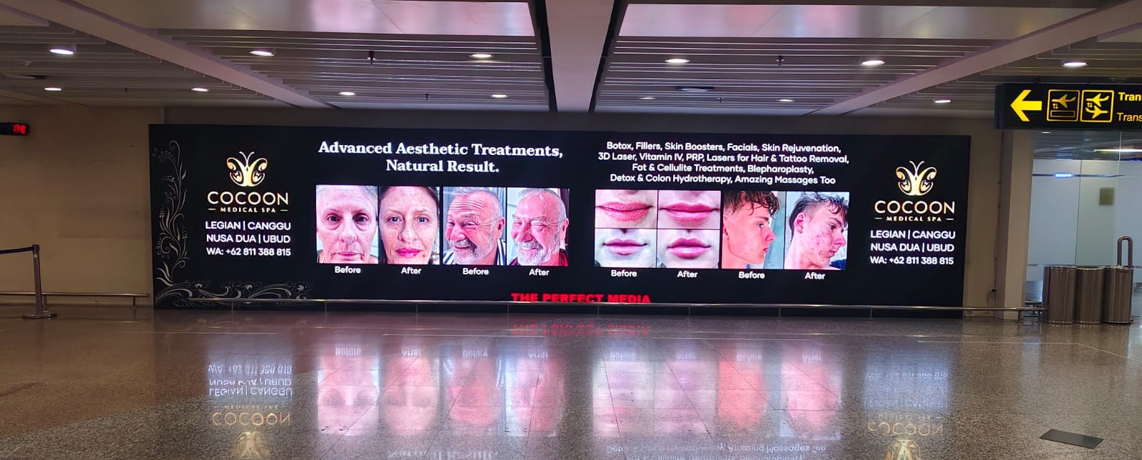 Cocoon Medical Spa, dengan lokasi eksklusif di Canggu dan Ubud, memanfaatkan media iklan bandara untuk mengundang wisatawan agar menggabungkan liburan mereka dengan perawatan tubuh yang menyegarkan. Dengan tampilan visual elegan dan LED berdampak tinggi, Cocoon menyampaikan bahwa Bali adalah tempat untuk menikmati keindahan sekaligus peremajaan.